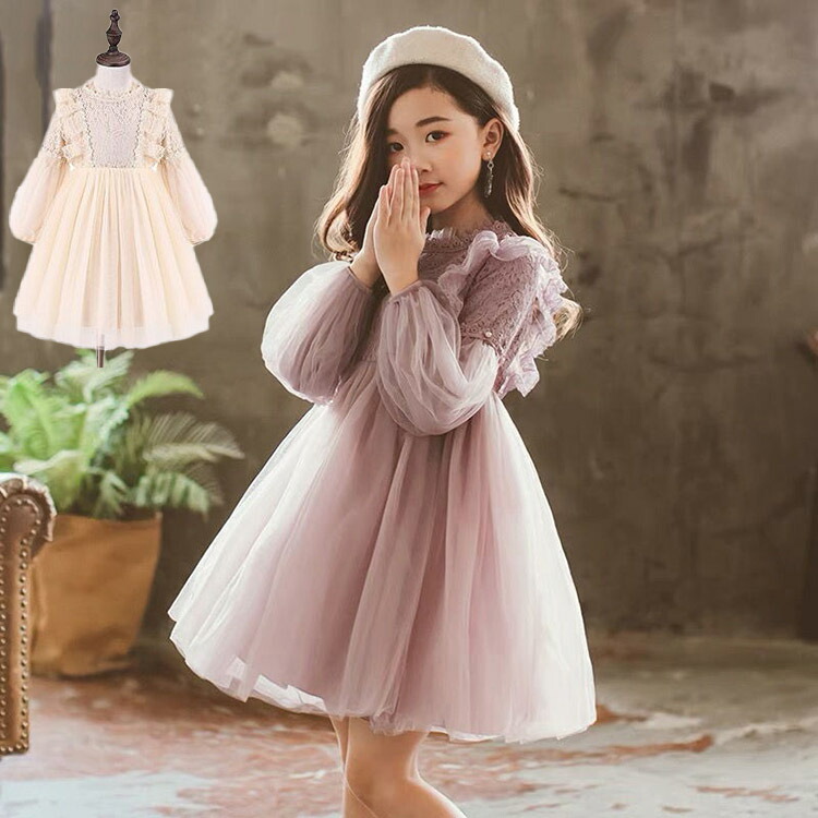 ワンピース こども 長袖 ドレス 女の子 ジュニア 長袖 フォーマル ワンピス チュール ワンピース シンプル お姫 ドレス 上品 膝丈 フレアワンピース 秋 冬 発表会 結婚式