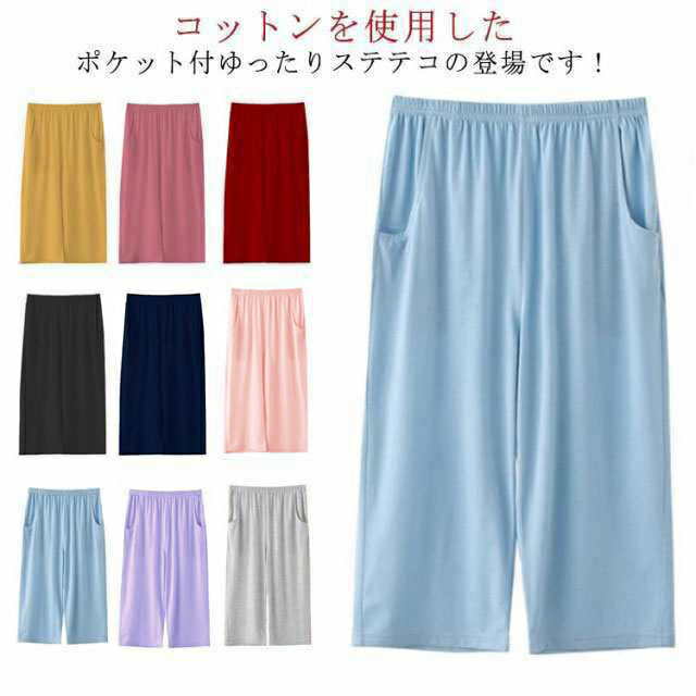 ワイドパンツ ステテコ ルームパンツ レディース コットン 綿 ルームウェア 部屋着 7分丈 ハーフパンツ 涼しい 春夏 ひざ下 イージーパンツ 通気性 無地 吸水性 ポケット付 ゆったり ボトムス