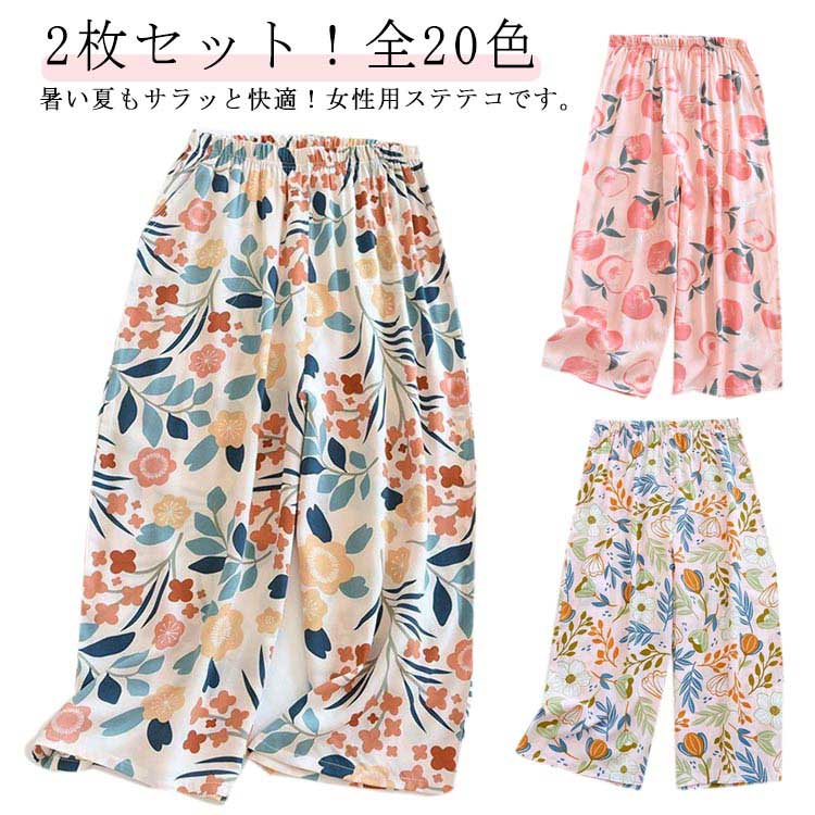2枚セット リラックスウエア リラックスパンツ レディース ルームウェア ルームパンツ パジャマ 夏用 薄手 イージーパンツ ひざ下 蒸れない 部屋着 ステテコ 涼しい 吸汗速乾 花柄 くま柄 ギフト