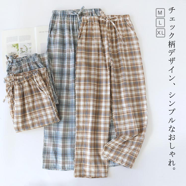 ルームウェア パジャマ レディース 春夏 秋 薄手 ルームパンツ チェック柄 ロングパンツ ウエストゴム 紐付き リラックス コットン 男女兼用 カジュアル 部屋着 寝間着