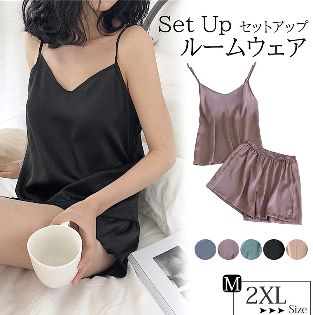 サテンの光沢がかわいらしさを演出 サテン調 ルームウェア キャミソール 上下セット パジャマ 無地 部屋着 全6色 ナイトウェア