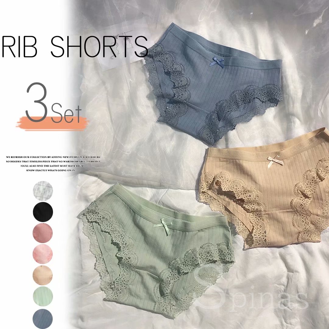 オールシーズン快適な履き心地 リブ ショーツ リボン 無地 インナー 女性用 伸縮性 3枚セット パンツ 下着ショーツ