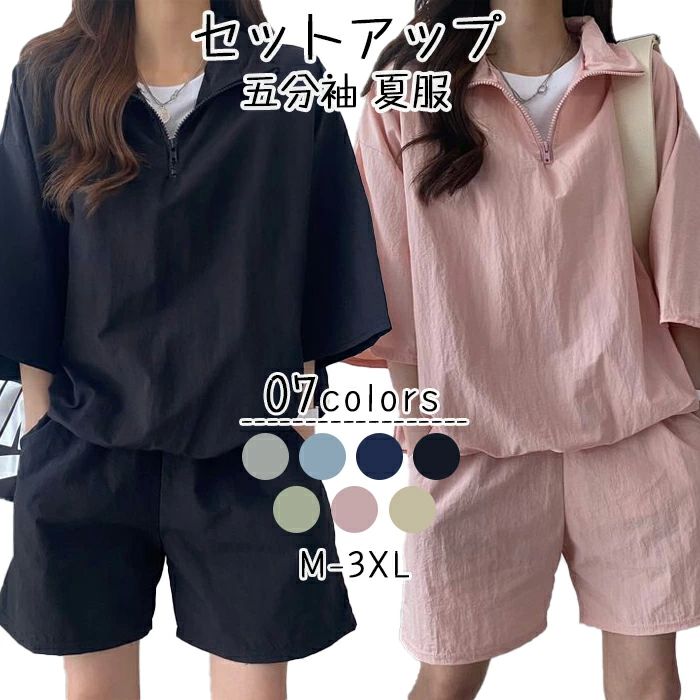 レディース セットアップ 五分袖 半袖Tシャツ+ショートパンツ 春夏 無地 ゆったり 上下セット 体型カバー 通勤 通学 カジュアル ファッション おしゃれ 楽ちん 可愛い スポーツウェア 5分丈袖