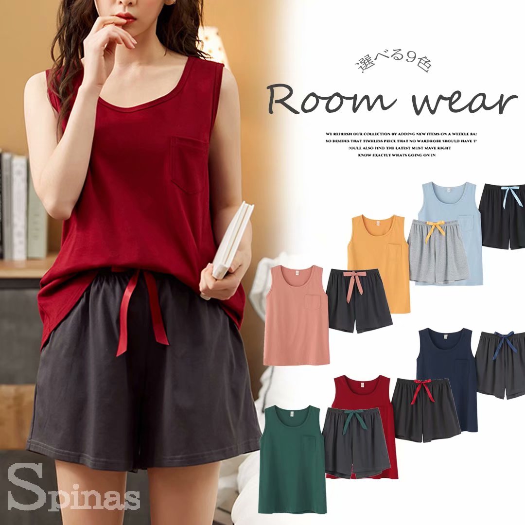 夏らしいノースリーブタイプ 配色 ルームウェア タンクトップ ショートパンツ 上下セット オシャレ パジャマ リラックス 部屋着