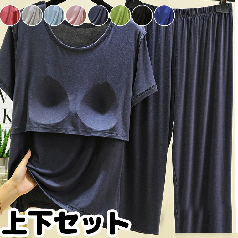 締め付けないカップ 上下セット 柔らかもっちり パット付半袖シャツ ラウンドネック アンダーフリー ゴムなし ブラトップ 半袖 前のみ パッドのみ 固定 カップ付き ハーフパンツ 短パ ルームウェア