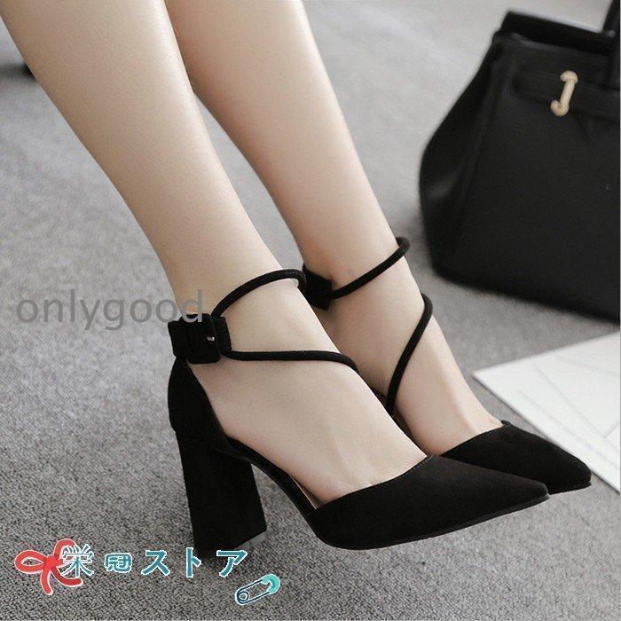 パンプス ポインテッドトゥ 7cm 太ヒール 痛くない アンクルストラップ パーティー 美脚パンプス 春 サンダル