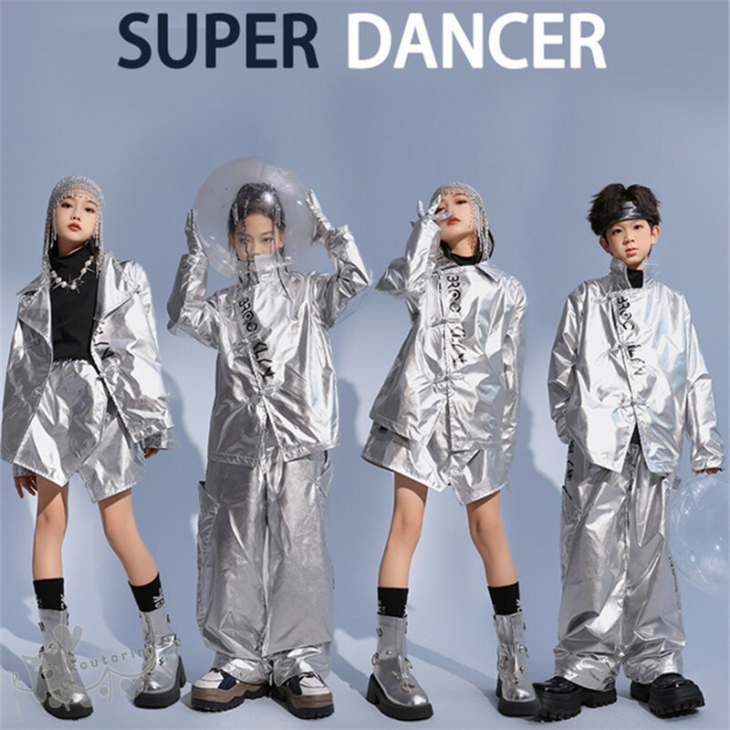 キッズダンス衣装 ヒップホップ 黒トップス シルバージャケットショート ロングパンツ ガールズ 男の子 派手 K-POP 韓国 ステージ衣装 応援団 体操服 発表会 hiphop 練習着