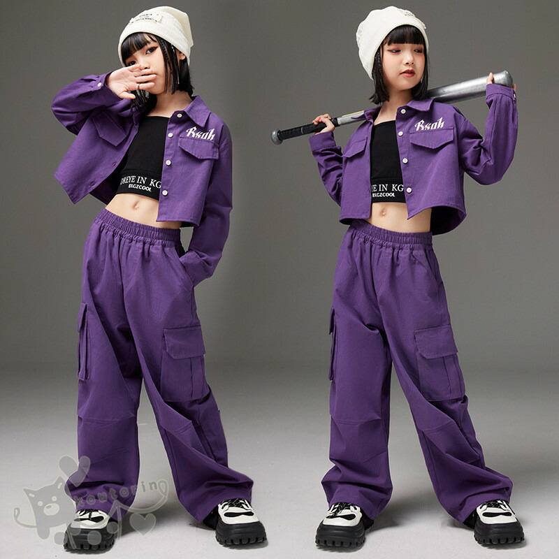 ダンス衣装 黒インナー 紫ジャケットカーゴ パンツ へそ出し キッズ ガールズ セットアップ 派手 K-POP 韓国 ステージ衣装 応援団 練習着 体操服 発表会 演出服 おしゃれ 12 hiphop