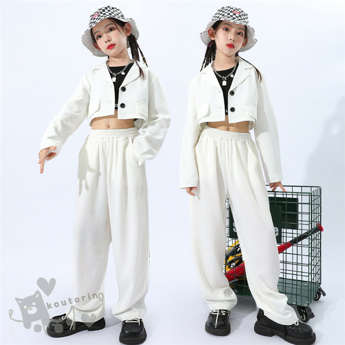 ダンス衣装 ヒップホップ スーツ 白 無地 ショートジャケットパンツ キッズダンス衣装 ガールズ 派手 K-POP 韓国 ステージ衣装 応援団 練習着 発表会 hiphop 演出 体操服