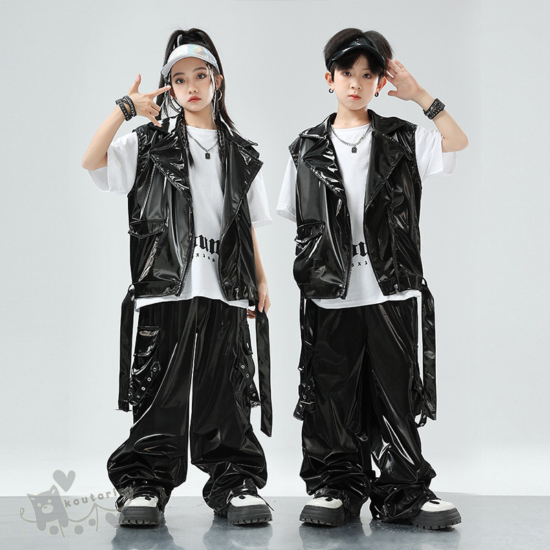 ダンス衣装 ヒップホップ k-pop衣装 白Tシャツ 黒レザーベスト カーゴパンツ キッズ ガールズ 男の子 セットアップ 派手 K-POP 韓国 ステージ衣装 応援団 体操服 発表会 hip 練習着