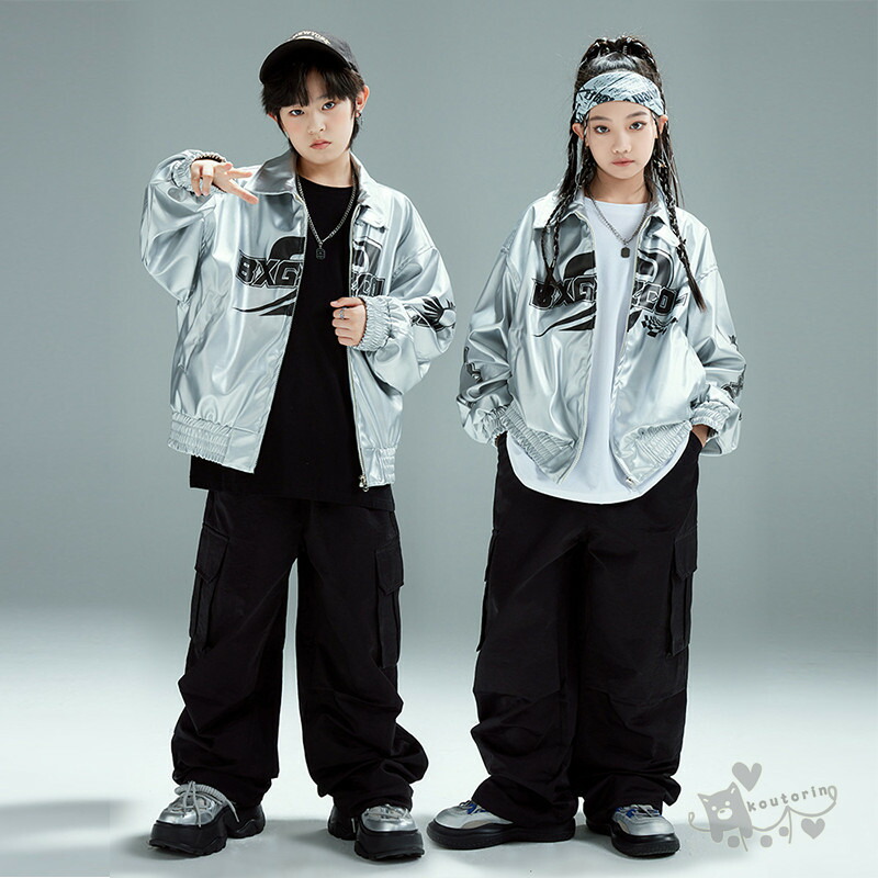 ダンス衣装 ヒップホップ k-pop衣装 白or黒Tシャツ シルバー ジャケット 黒カーゴパンツ キッズ ガールズ 男の子 セットアップ 派手 K-POP 韓国 応援団 練習着 体操服 ステージ衣装