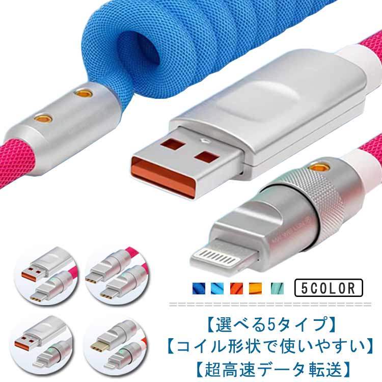 コイル USB-C USB-A ケーブル to USB Lightning PD対応 iPhone15用 伸縮 Type C 急速充電データ転送