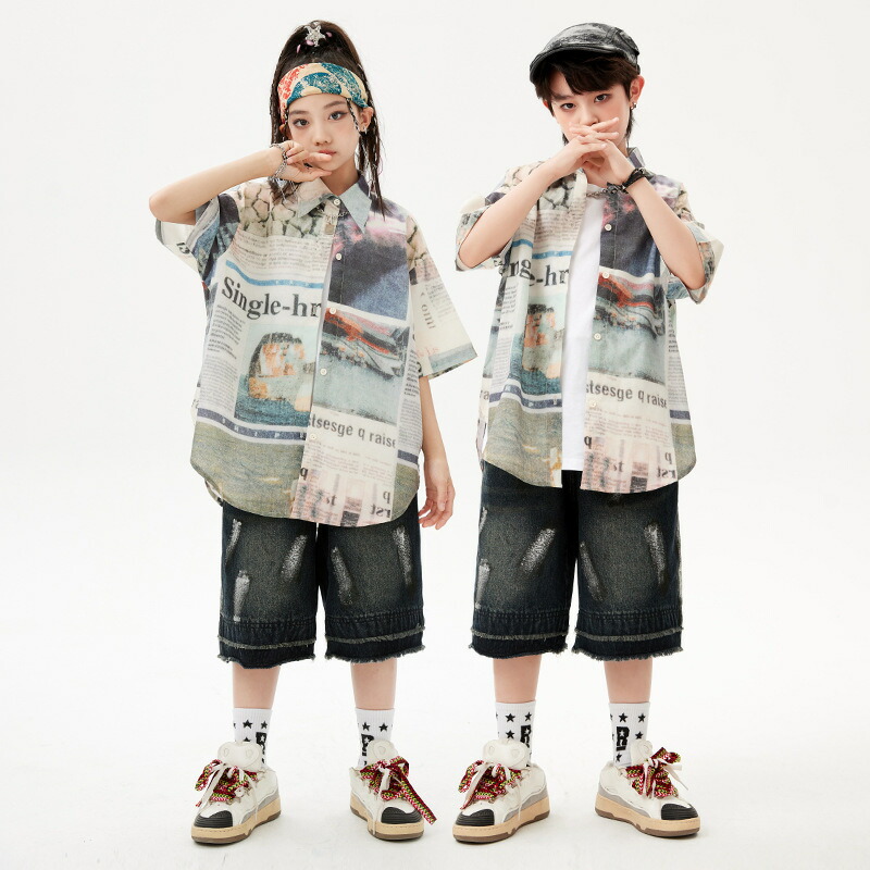 キッズ ダンス衣装 シャツ デニムパンツ ダメージ加工 ゆったり 総柄 かっこいい セットアップ 男の子 女の子 韓国 HIPHOP K-POP ズボン レトロ ストリートダンス 演出服 発 柄シャツ