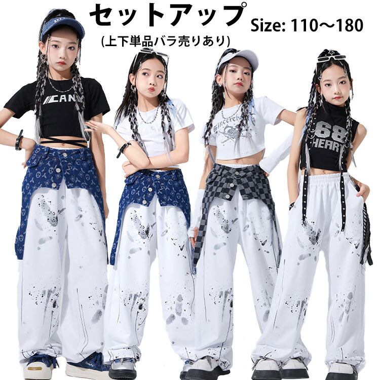 キッズ ダンス衣装 パンツ セットアップ ショートトップス デニム腰巻 かっこいい 女の子 韓国 ヒップホップ HIPHOP K-POP ペイントパンツ 長ズボン ストリートダンス 演出 ロングパンツ