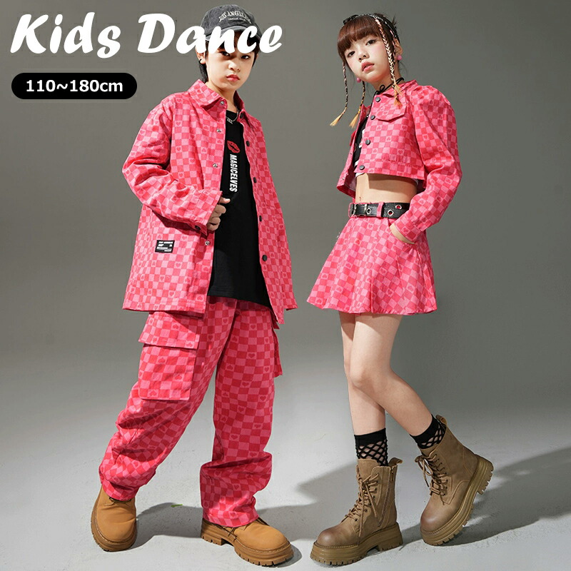 キッズ ダンス衣装 セットアップ チェック ジャケット スカート イベント かっこいい 女の子 男の子 韓国 ヒップホップ HIPHOP K-POP ジャズ ダンス ダンスウェア 練習着 ストリート