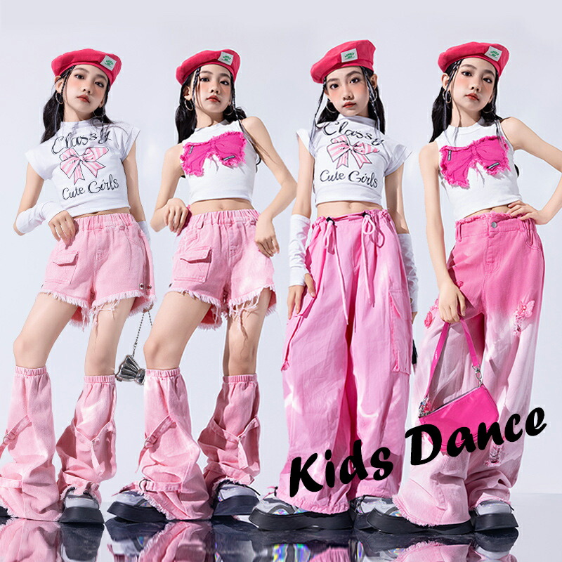 キッズ ダンス衣装 セットアップ 半袖 へそ出し 韓国 jazz 子供ダンス おしゃれ 女の子 ピンク デニム パンツ ホワイト トップス ストリート ステージ衣装 HIPHOP 演出服 応援 練習着