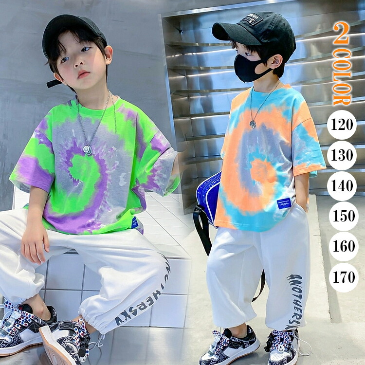 2カラー 6サイズ タイダイ風 キッズトップス キッズダンス ヒップホップ キッズ半袖シャツ うずまき 半袖 オレンジ グリーン カラフル レッスン着 練習着