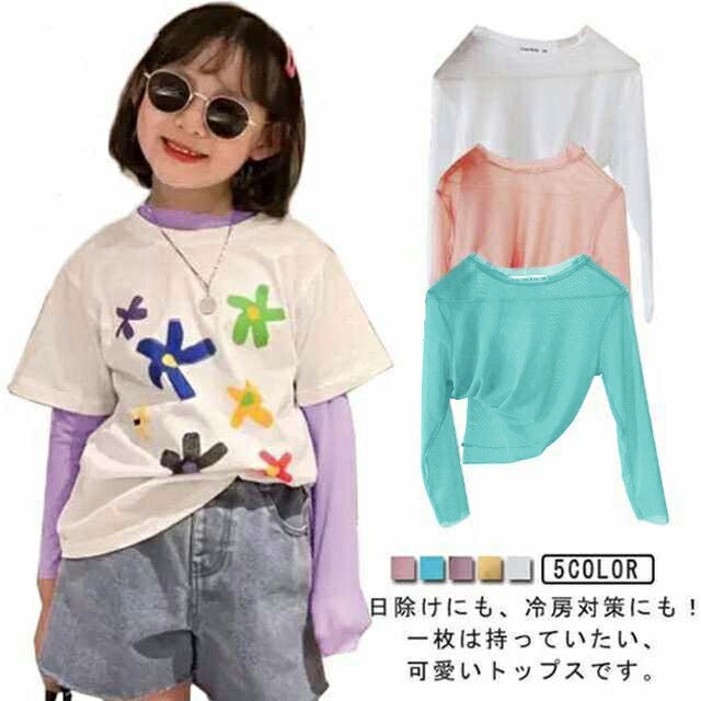 キッズ 冷房対策 シアートップス スパンコール 女の子 レイヤード 2枚セット 薄手 夏 長袖シャツ 吸水速乾 男の子 無地 きらきら おしゃれ 重ね着 90 100 110 子供服
