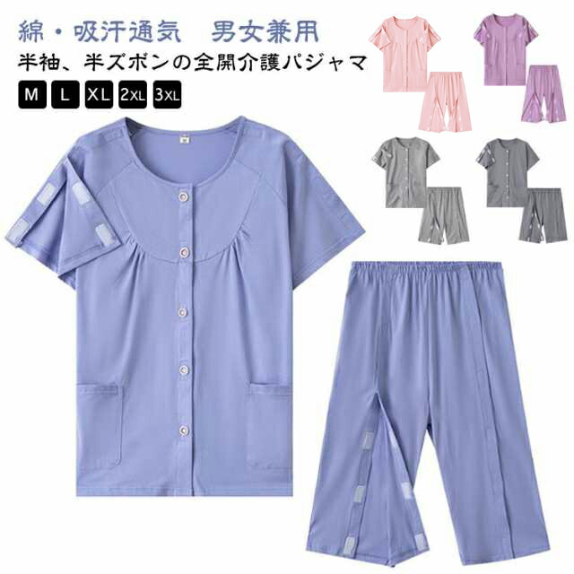 レディース 寝たきり 両開き 吸汗 寝間着 綿 メンズ マジックテープ 両脇全開 半ズボン 介護用パジャマ 上下セット 春夏 半袖 コットン 介護パジャマ オムツ交換 全開 柔らか 着脱簡単 前 通気