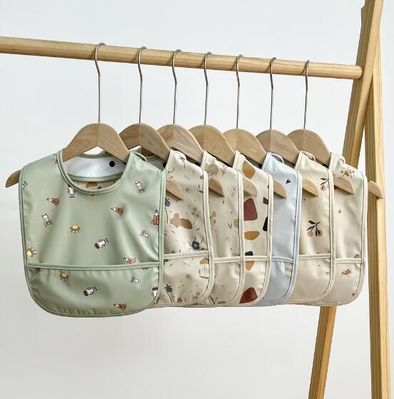 お食事エプロン9デザイン赤ちゃんベビー離乳食防水女の子男の子ビブスタイポケット韓国おしゃれ可愛い袖なし ナチュラルボタン保育園ポリウレタンエプロン