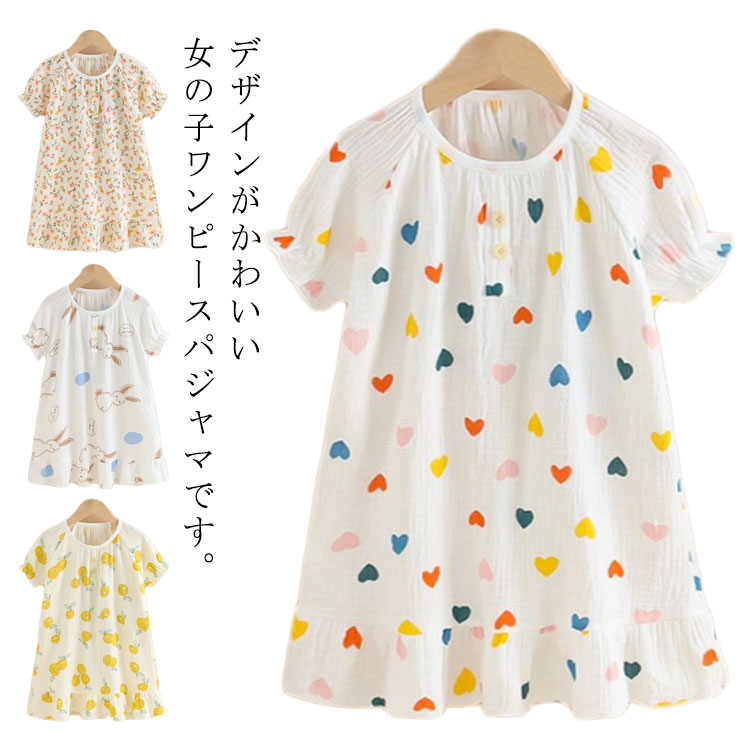 ワンピース キッズ 半袖 コットン ルームウエア パジャマ ガールズ ワンピタイプ 春 夏 綿 カーゼ ナイトウェア 女の子 かわいい 部屋着 入園 入学 入園グッズ ゆったり