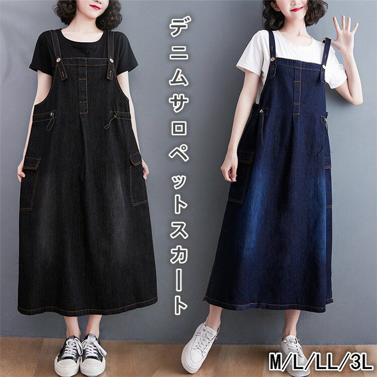 サロペット ワンピース デニム マキシワンピース 上下セット 体型カバー ハイウエスト オールインワン ロング ジャンパースカート マキシワンピ デニムワンピース レイヤード 重ね着 ブラック