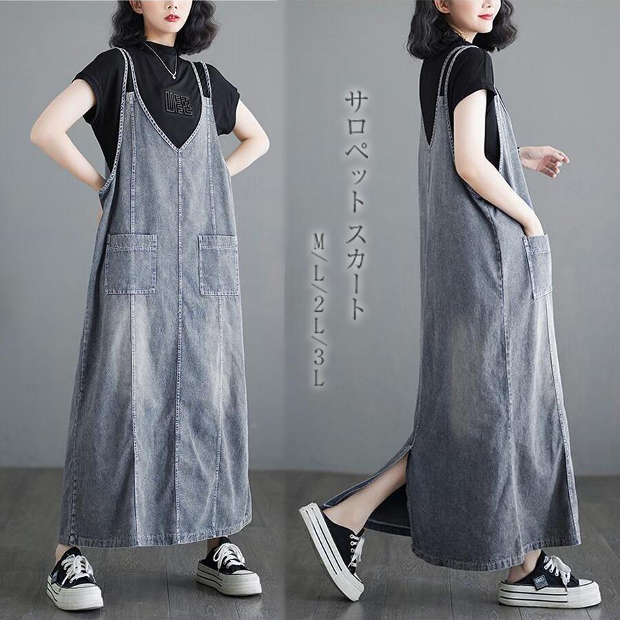 ジャンパースカート サロペットスカート オーバーオール オールインワン デニムワンピース ロング丈 デニムノースリーブ 体型カバー マキシ丈 レディースワンピース ワンピース お出かけ エプロ 大きめ