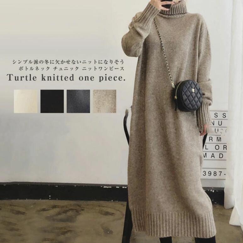 ニットワンピース タートルネック チュニック ハイネック 長袖 タートル ロング ニットワンピ ワンピース 無地 膝下丈 ゆったり ナチュラル 服 秋冬 30代 40代 大きいサイズ 通勤 レ 50代