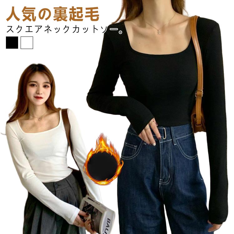 長袖 カットソー インナー 暖かい おしゃれ リブニット 裏起毛 黒 ニットセーター ブラック 重ね着 スクエアネック トップス レディース 秋冬 白 大きいサイズ シンプル プルオーバー 可愛 防寒